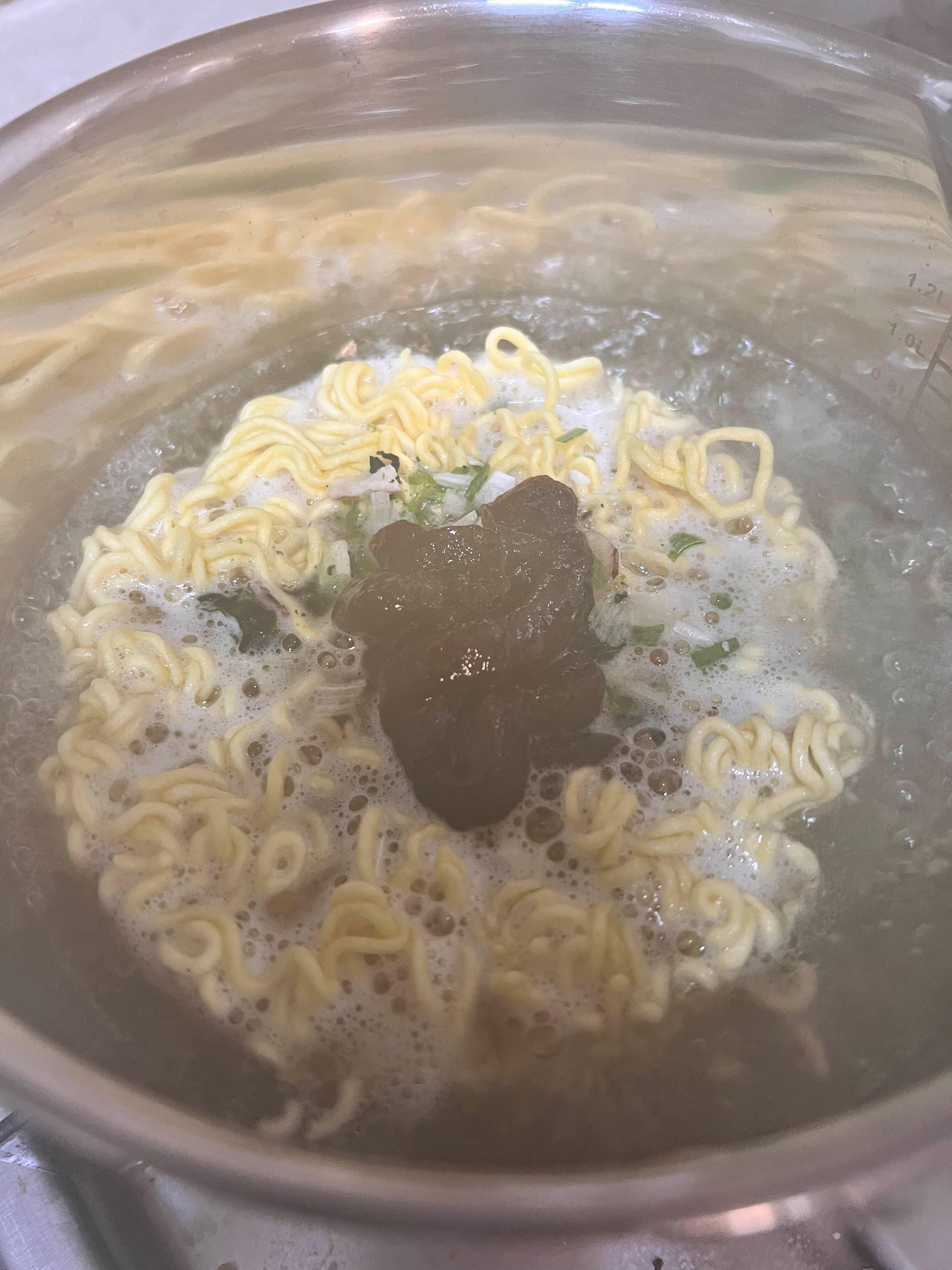 - 끓는 물에 면, 국물, 건더기를 한번에 같이 넣기