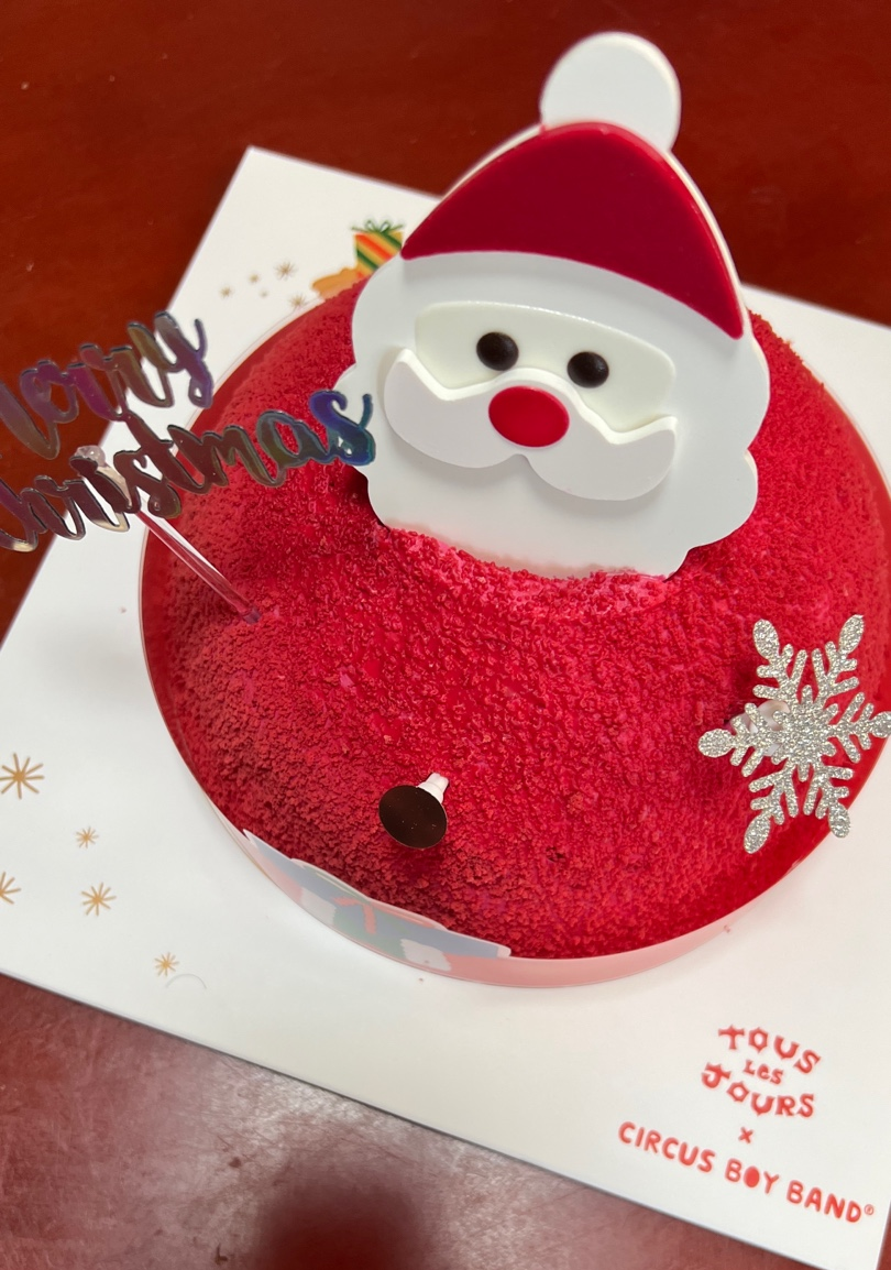 케이크설명 : 두 가지 초콜릿 시트 사이에 고소한 헤이즐넛 크림이 샌드되고 초코 크런치로 재밌는 식감을 살린 산타 케이크. 실제로 엄마집 근처에서 구매했는데 넘 귀여웠어요. 산타모양은 데코이면서 초코렛입니다. 개인적으로 케이크 크기 작은 걸 선호합니다. 케이크 남으면 조금 골치 아프기도 해요.