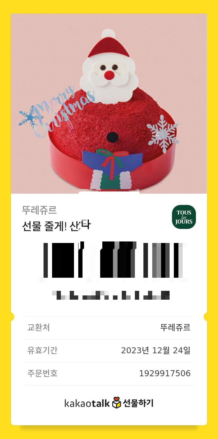 엄마집 가기 전, 크리스마스 케이크를 구매했습니다. 바로 매장가서 구매하기보다는 현재 할인기간이니까 나에게 선물하기를 이용합니다. 항상 P사를 이용했는데 이슈가 있다보니 이번에는 뚜레쥬르 케이크로 구매했습니다.