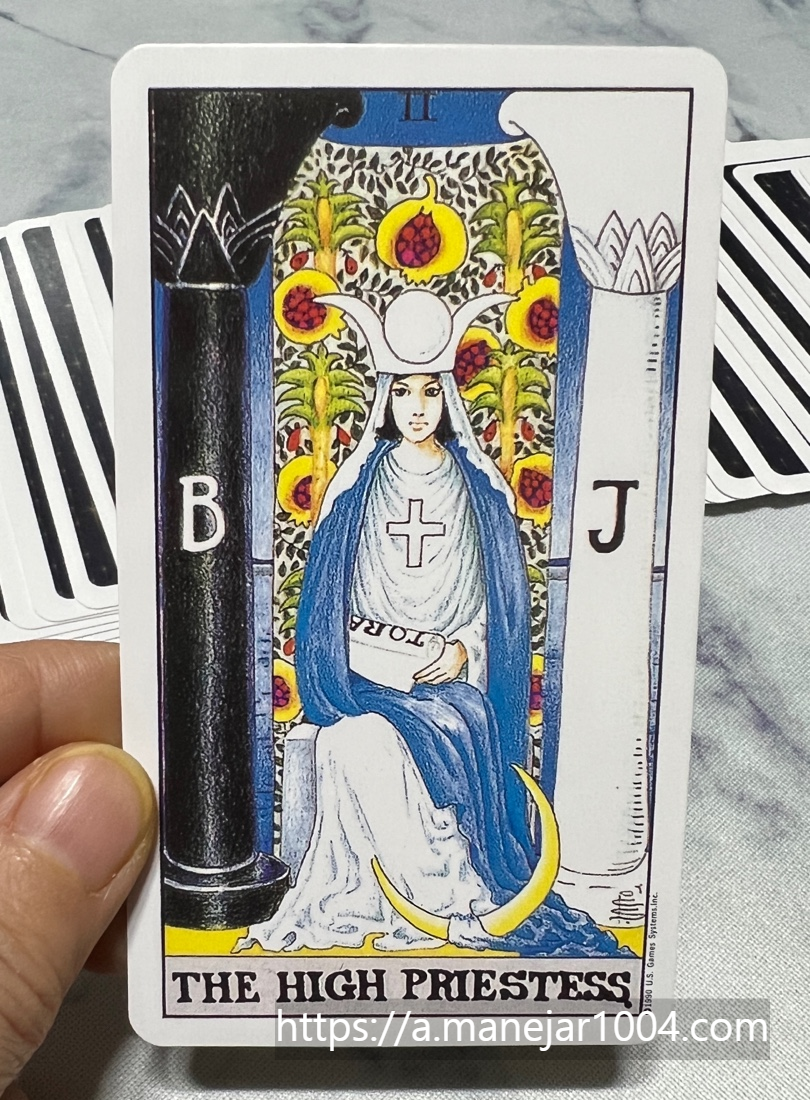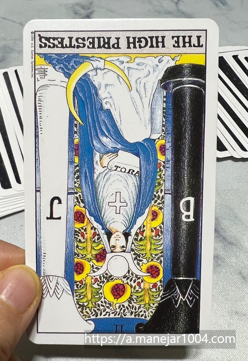 정방향으로는 외유내강과 정신적인 풍요로움으로 읽습니다. 자기만의 영역을 확실히 자리매김합니다. 역방향으로는 외롭고 고집이 세고 폐쇄적이다로 읽습니다. 성격적으로 내향적이며 비밀이 많은 편입니다. 그래서 더 비밀스러운 분위기를 자아냅니다. 고위여사제이기에 맡은 일에 대해선 책임과 의무를 다합니다.
