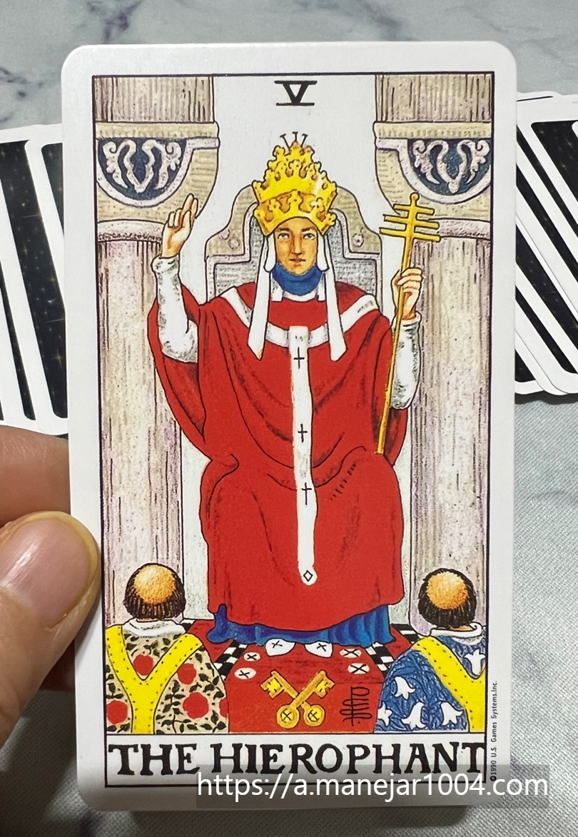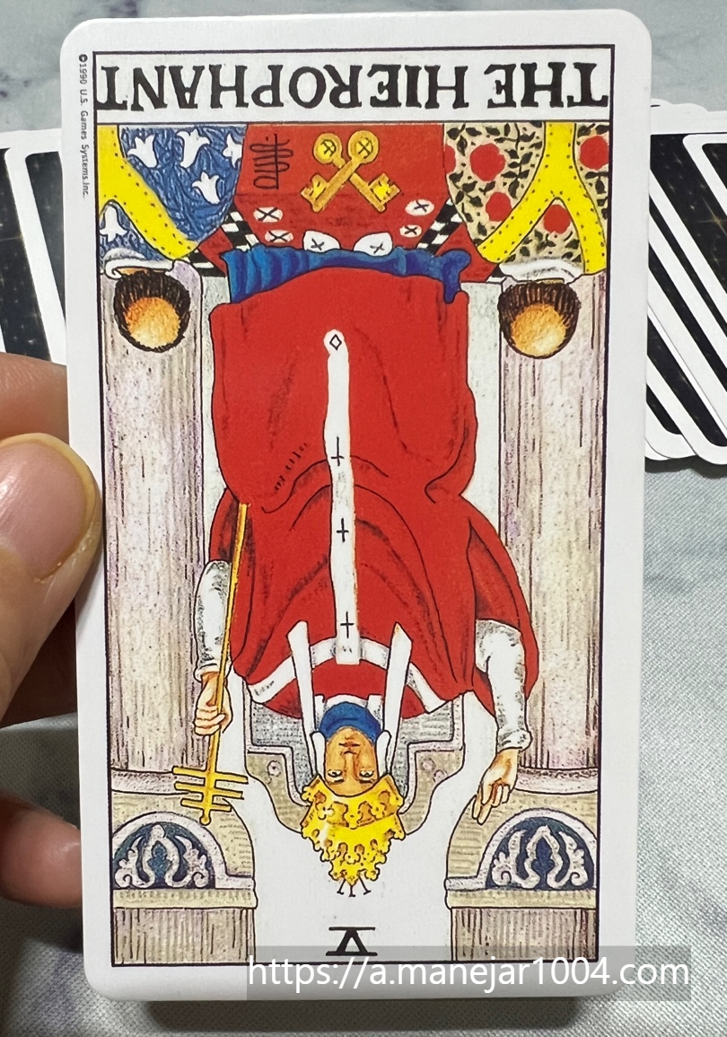 정방향으로는 종교지도자, 중재자이자 지혜로운 사제입니다. 관대한 성향입니다. 역방향으로는 두 가지 일과 마음이 공존하며 실천력이 부족하고 나태합니다.