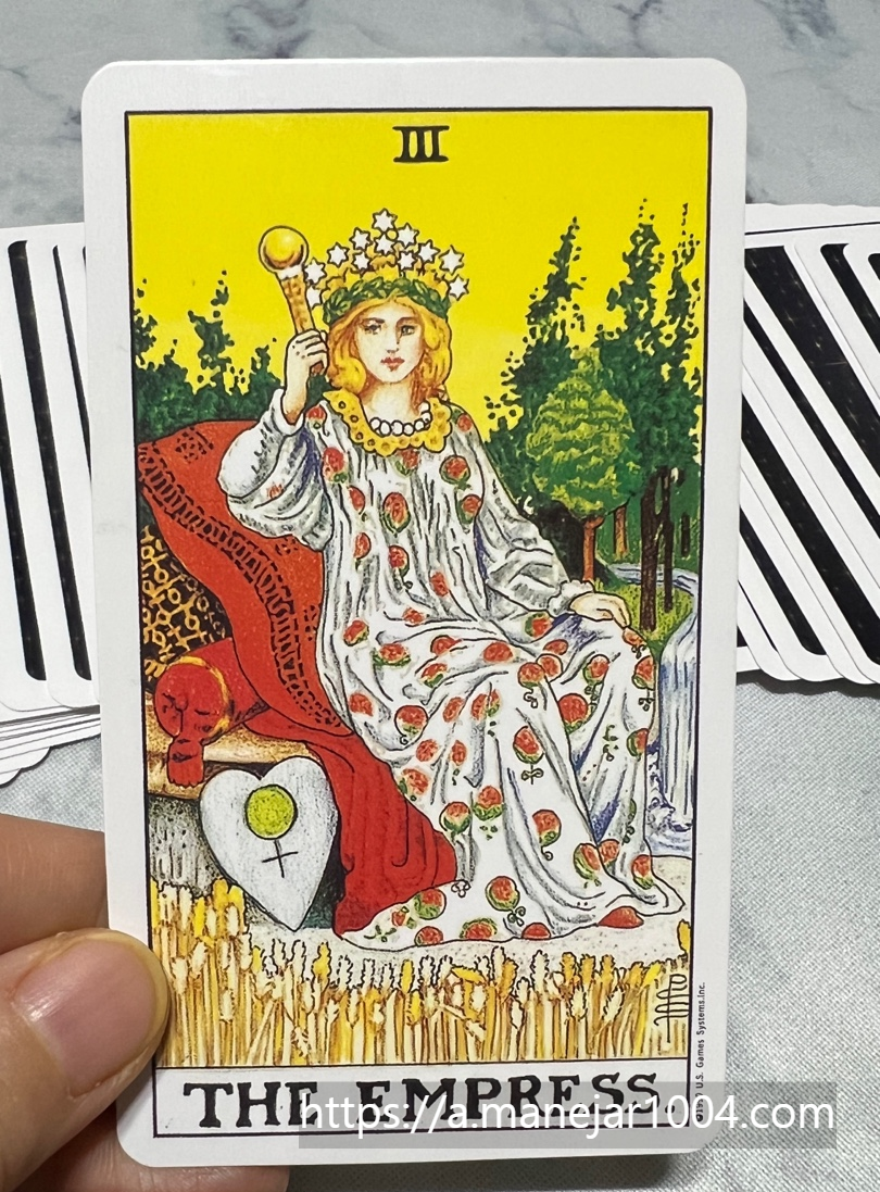 정방향으로는 모성애가 많고 포근한 성향입니다. 리더쉽이 있고 여유롭습니다. 풍요롭고 사랑이 넘치면서 안주하게 되는 카드입니다. 결실을 보여주는 카드로 읽을 수 있습니다. 역방향으로는 게으르고 나태하면서 약간의 이기심도 보인다고 읽습니다.