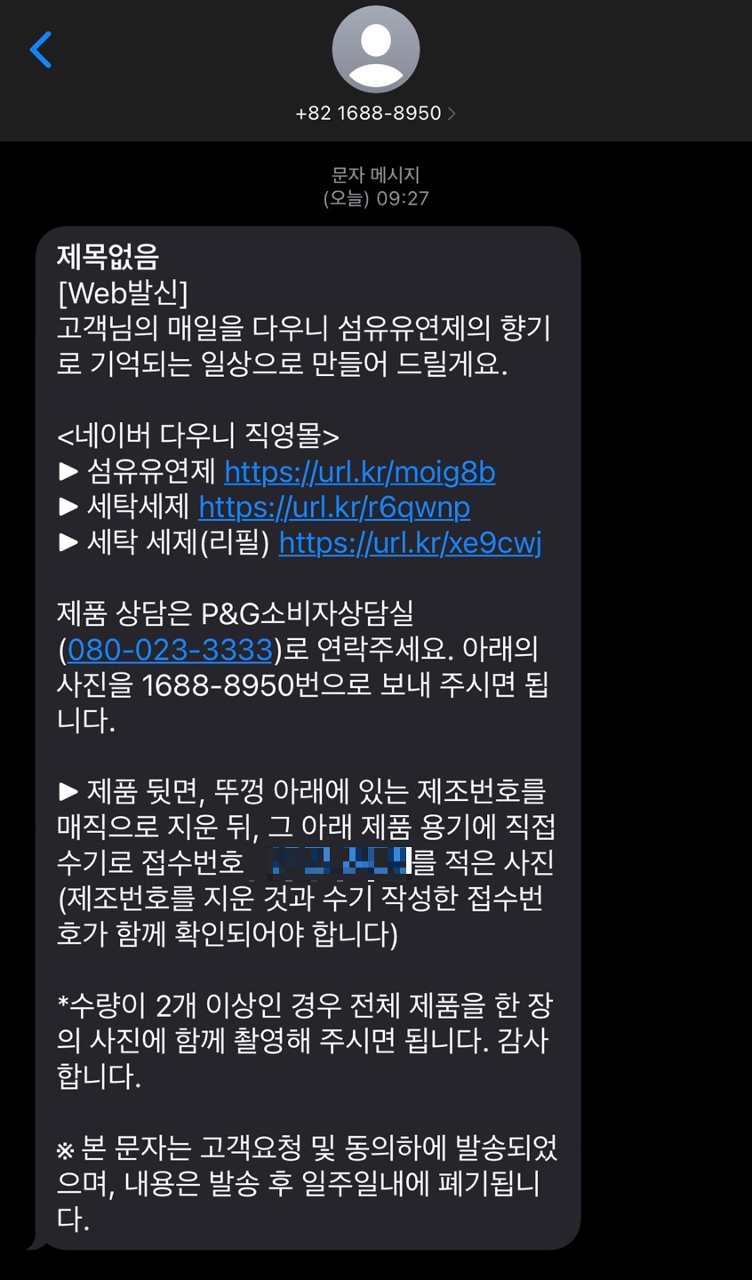 안내 문자를 받고 사진찍어서 제조번호를 매직으로 지우고 문자로 온 번호를 적어서 사진을 전송합니다.  문자로 온 번호는 1688-8950.  저는 수량이 3개라서 한꺼번에 놓고 찍어서 사진을 보냈습니다.